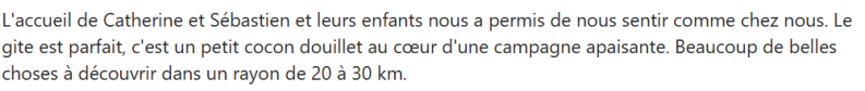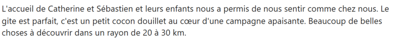 Autour du gîte, il y a des découvertes pour tous : balades en nature, villages pittoresques, activités culturelles ou ludiques… de quoi ravir petits et grands, amateurs de calme ou d’aventure ! Les voyageurs qui séjournent plus longtemps chez nous profitent souvent d’une ou deux journées pour explorer les environs un peu plus loin (à environ 1 heure de route). C’est l’occasion idéale de découvrir le charme du vieux port de La Rochelle , de profiter des magnifiques plages vendéennes , de s’évader sur 'Île de Ré ou encore de vivre une expérience inoubliable au Puy du Fou.